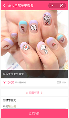 美甲小程序支持輸入關(guān)鍵字即可進(jìn)行全平臺搜索,方便消費(fèi)者查找購買相關(guān)產(chǎn)品。商家開展拼團(tuán)、砍價等活動,消費(fèi)者分享朋友圈、微博等邀請好友一起來體驗(yàn),為店鋪帶來了更多的流量,從而獲得了更多紅利。