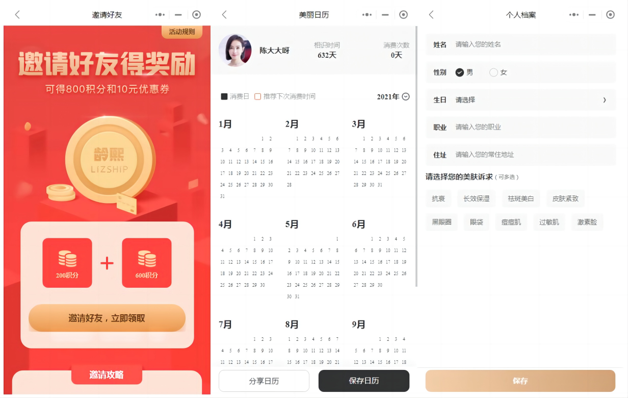 可在小程序上記錄每次美容時間,并推薦下次美容時間,可進行分享日歷和保存日歷操作。